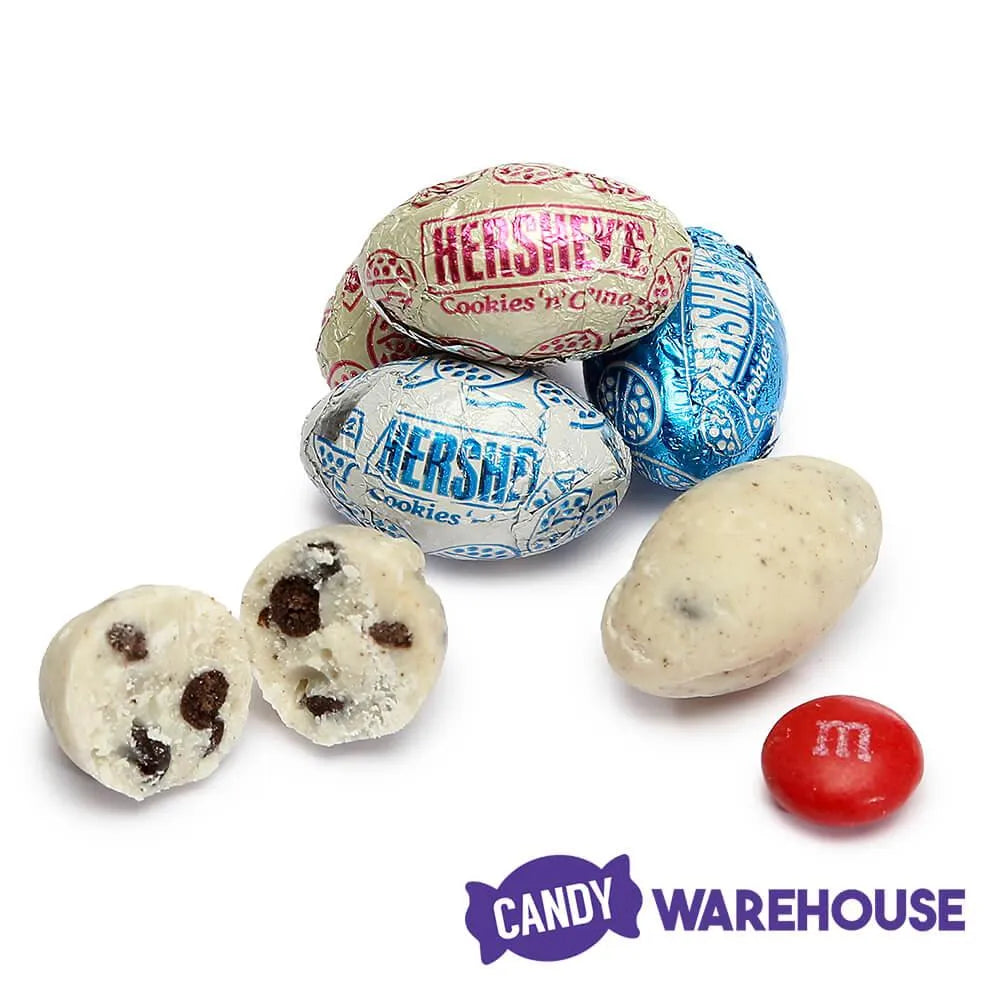 Delicious white chocolate creme eggs infused with crushed cookies! Each egg is wrapped in metallic foils of white, cream, or pastel blue. Egg Length: 1 Inch Bag contains 8.5 ounces of Hershey’s Cookies ‘n’ Creme Candy Eggs…. that’s about 48 pieces. Made in the USA. Shipping Weight ~ 1 lb. Kosher Certified.