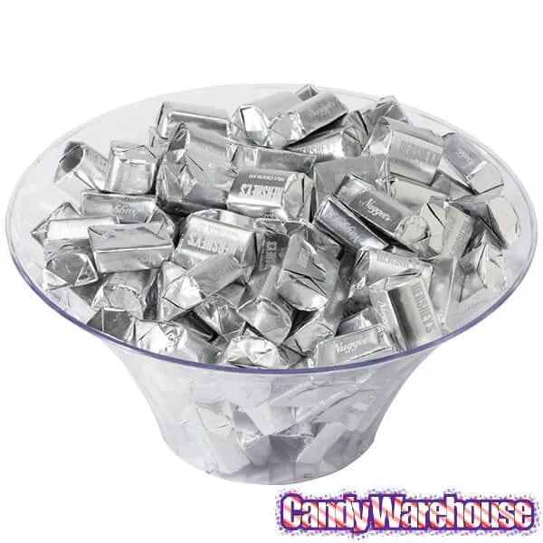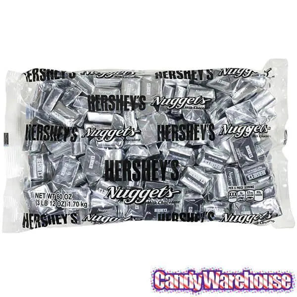 Bag contains 3.75 pounds of Hershey’s Nuggets Silver Foiled Milk Chocolate Candy.