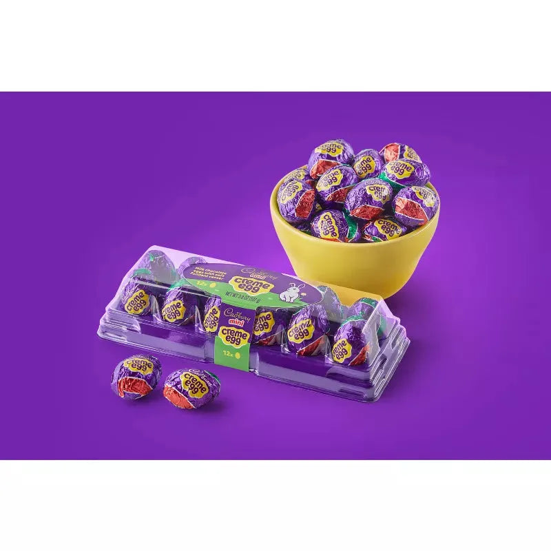 Carton holds 12 foiled Cadbury Mini Creme Eggs. Total net weight is 3.8 ounces.